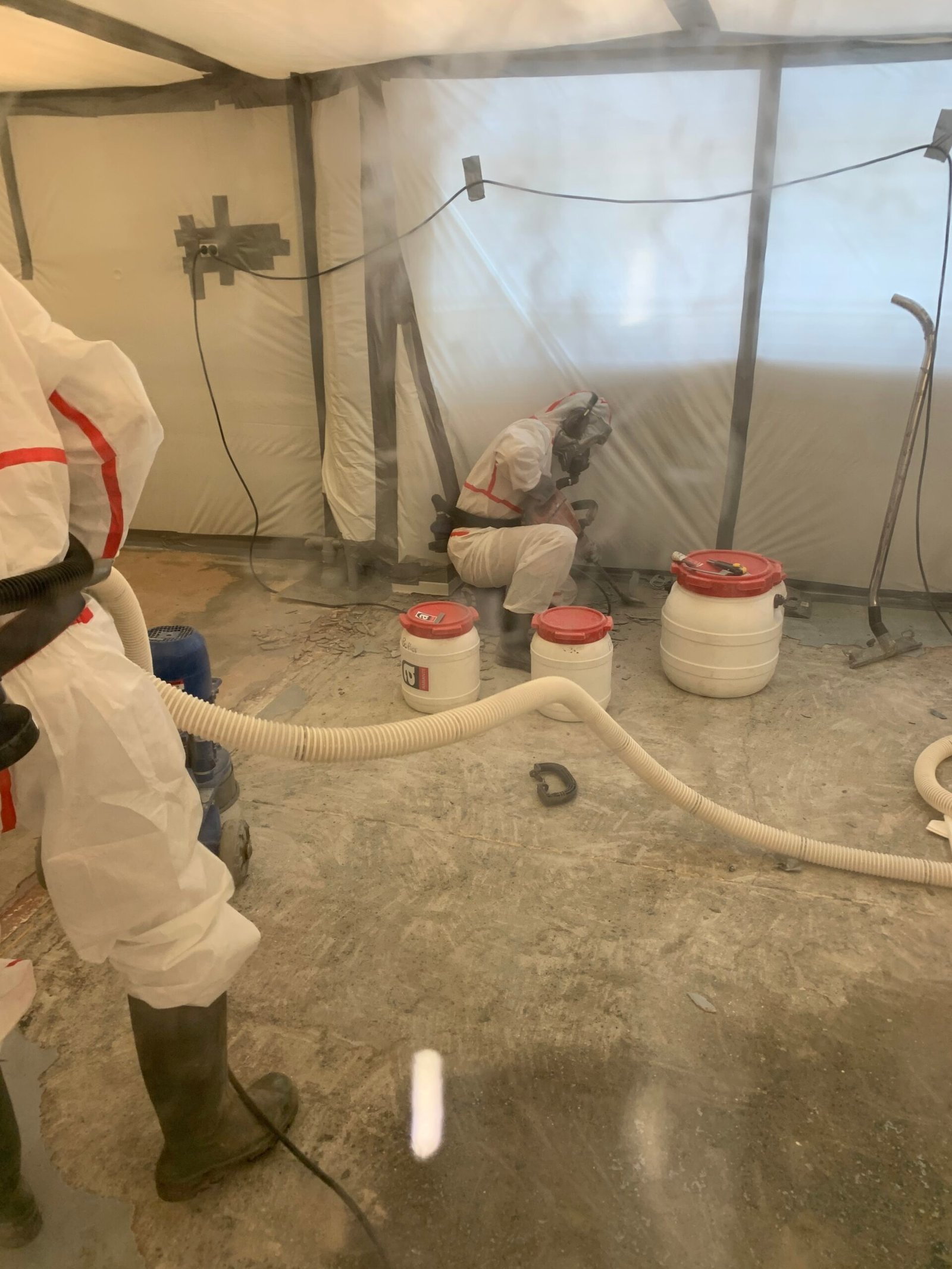 Chantier réalisé sous confinement intérieur avec maintien d’une dépression constante. Le retrait de dalles de sol amiantées a été effectué manuellement avec aspiration à la source et conditionnement immédiat dans des fûts étanches.